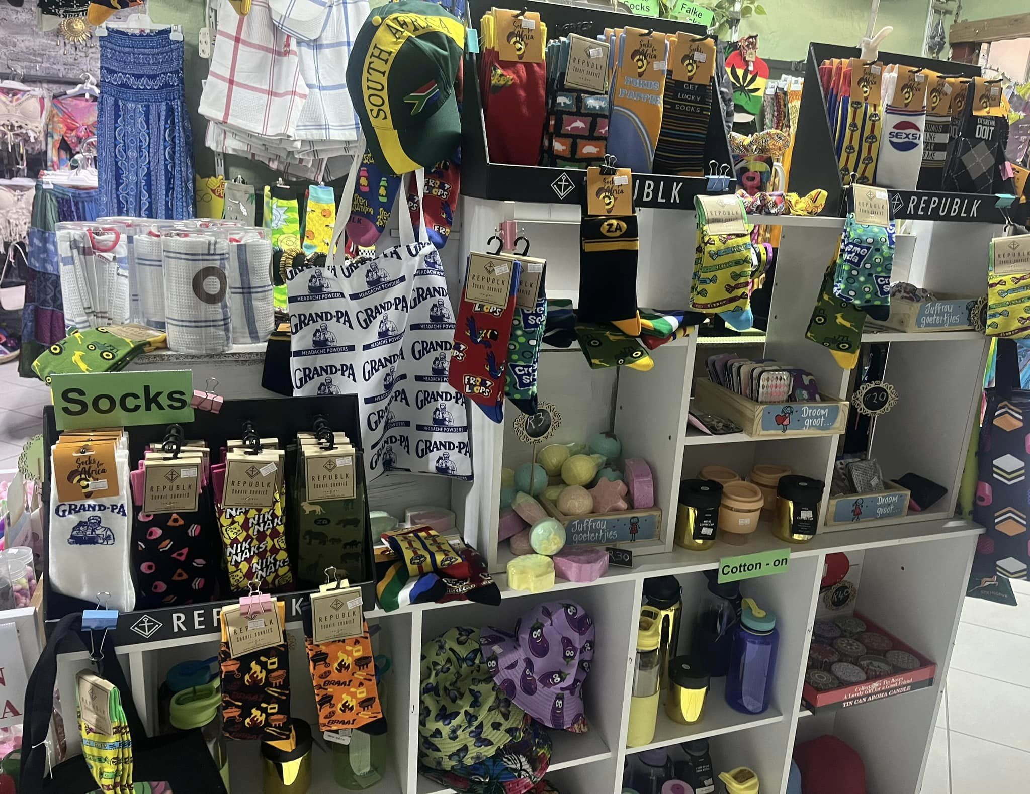 From stylish clothing like Bokomo & Snowflake Pants and Braaibroeke to eye-catching accessories such as trendy bags, fun plasters, and whimsical hats, we curate our collection with a focus on quality and personality. Our selection also includes delightful items like bath salts, funky coffee cups, and portable fans, ensuring you find something special every time you visit.